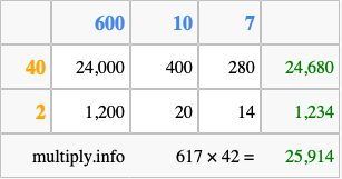 That's all there is to it! As you can see from the box above, the answer to 617 times 42 using the box method is 25,914.