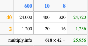 That's all there is to it! As you can see from the box above, the answer to 618 times 42 using the box method is 25,956.