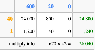 Finally, we add up all the sums we found in step 3 to get our final answer to 620 times 42.