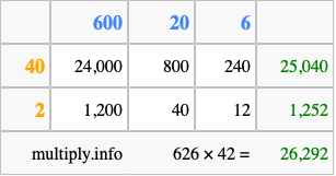 Below is an illustration showing you how to calculate 626 times 42 using the box method, using the instructions above.