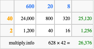 That's all there is to it! As you can see from the box above, the answer to 628 times 42 using the box method is 26,376.