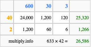 Below is an illustration showing you how to calculate 633 times 42 using the box method, using the instructions above.