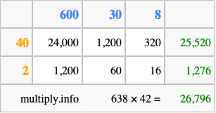 Below is an illustration showing you how to calculate 638 times 42 using the box method, using the instructions above.