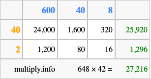 Finally, we add up all the sums we found in step 3 to get our final answer to 648 times 42.