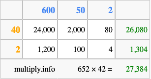 Finally, we add up all the sums we found in step 3 to get our final answer to 652 times 42.