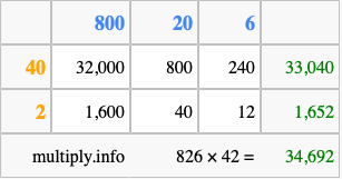 That's all there is to it! As you can see from the box above, the answer to 826 times 42 using the box method is 34,692.