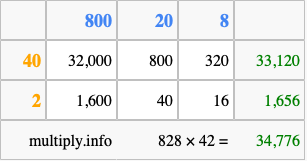 That's all there is to it! As you can see from the box above, the answer to 828 times 42 using the box method is 34,776.