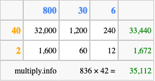 That's all there is to it! As you can see from the box above, the answer to 836 times 42 using the box method is 35,112.