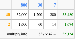Finally, we add up all the sums we found in step 3 to get our final answer to 837 times 42.