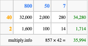 That's all there is to it! As you can see from the box above, the answer to 857 times 42 using the box method is 35,994.