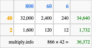 That's all there is to it! As you can see from the box above, the answer to 866 times 42 using the box method is 36,372.