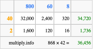 Finally, we add up all the sums we found in step 3 to get our final answer to 868 times 42.