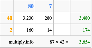 That's all there is to it! As you can see from the box above, the answer to 87 times 42 using the box method is 3,654.