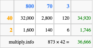 Finally, we add up all the sums we found in step 3 to get our final answer to 873 times 42.