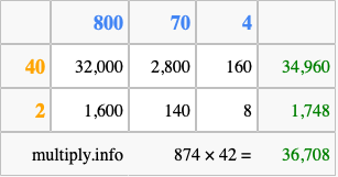 That's all there is to it! As you can see from the box above, the answer to 874 times 42 using the box method is 36,708.