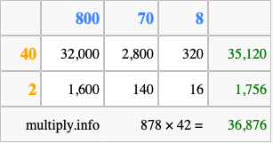Finally, we add up all the sums we found in step 3 to get our final answer to 878 times 42.