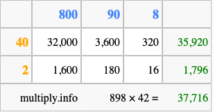 Finally, we add up all the sums we found in step 3 to get our final answer to 898 times 42.