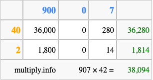 That's all there is to it! As you can see from the box above, the answer to 907 times 42 using the box method is 38,094.