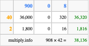 That's all there is to it! As you can see from the box above, the answer to 908 times 42 using the box method is 38,136.