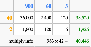 That's all there is to it! As you can see from the box above, the answer to 963 times 42 using the box method is 40,446.