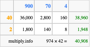 That's all there is to it! As you can see from the box above, the answer to 974 times 42 using the box method is 40,908.