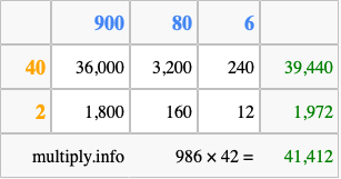 Below is an illustration showing you how to calculate 986 times 42 using the box method, using the instructions above.