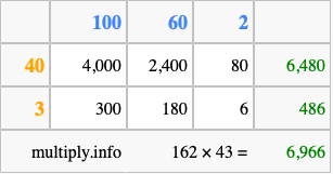 Finally, we add up all the sums we found in step 3 to get our final answer to 162 times 43.