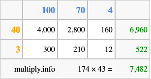 Below is an illustration showing you how to calculate 174 times 43 using the box method, using the instructions above.