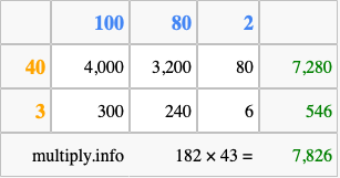 Below is an illustration showing you how to calculate 182 times 43 using the box method, using the instructions above.
