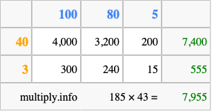 That's all there is to it! As you can see from the box above, the answer to 185 times 43 using the box method is 7,955.