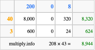 That's all there is to it! As you can see from the box above, the answer to 208 times 43 using the box method is 8,944.