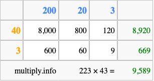 Below is an illustration showing you how to calculate 223 times 43 using the box method, using the instructions above.