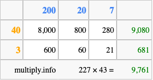 Below is an illustration showing you how to calculate 227 times 43 using the box method, using the instructions above.