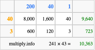 Finally, we add up all the sums we found in step 3 to get our final answer to 241 times 43.