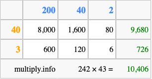 Below is an illustration showing you how to calculate 242 times 43 using the box method, using the instructions above.