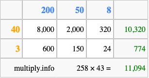 That's all there is to it! As you can see from the box above, the answer to 258 times 43 using the box method is 11,094.