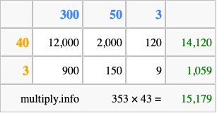 Finally, we add up all the sums we found in step 3 to get our final answer to 353 times 43.
