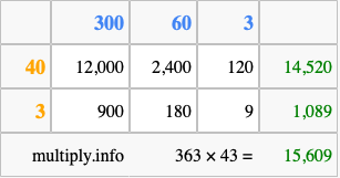 That's all there is to it! As you can see from the box above, the answer to 363 times 43 using the box method is 15,609.