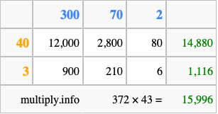 That's all there is to it! As you can see from the box above, the answer to 372 times 43 using the box method is 15,996.