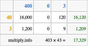 That's all there is to it! As you can see from the box above, the answer to 403 times 43 using the box method is 17,329.