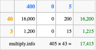 That's all there is to it! As you can see from the box above, the answer to 405 times 43 using the box method is 17,415.