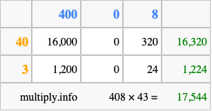 Below is an illustration showing you how to calculate 408 times 43 using the box method, using the instructions above.