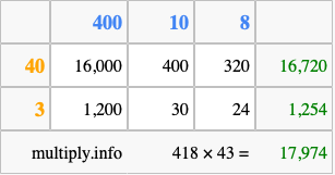 Finally, we add up all the sums we found in step 3 to get our final answer to 418 times 43.