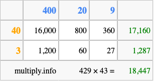 Below is an illustration showing you how to calculate 429 times 43 using the box method, using the instructions above.