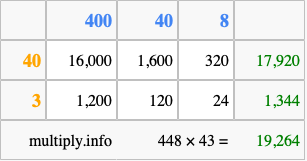 Finally, we add up all the sums we found in step 3 to get our final answer to 448 times 43.