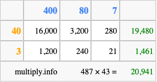 Finally, we add up all the sums we found in step 3 to get our final answer to 487 times 43.