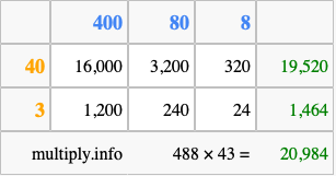That's all there is to it! As you can see from the box above, the answer to 488 times 43 using the box method is 20,984.