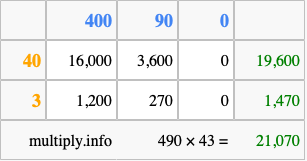 That's all there is to it! As you can see from the box above, the answer to 490 times 43 using the box method is 21,070.