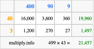 That's all there is to it! As you can see from the box above, the answer to 499 times 43 using the box method is 21,457.
