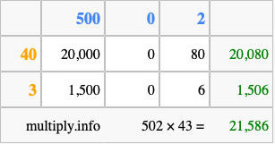 That's all there is to it! As you can see from the box above, the answer to 502 times 43 using the box method is 21,586.